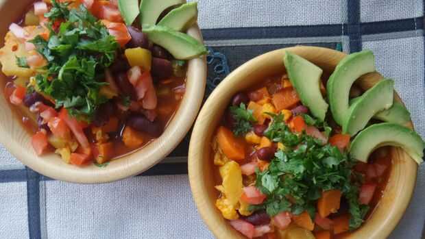 Chile es ideal para parrilladas de verano y vestir su vegetariano perros y hamburguesas de frijol negro, pero este chili vegano es una buena receta para colgar a los meses más fríos, también. Tenemos varias latas de frijoles y tomates en cuadritos en