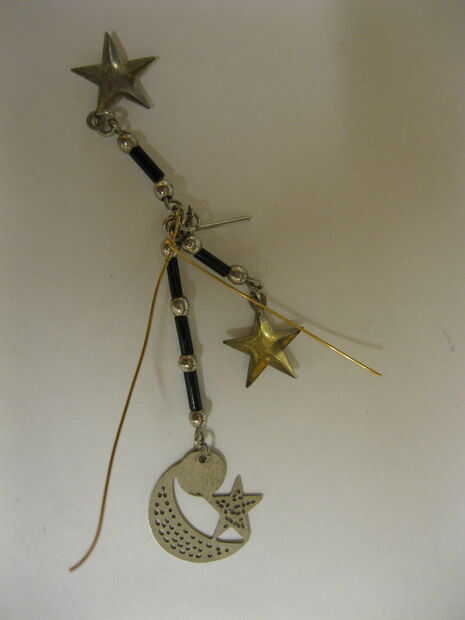 y luego me encontré con un viejo pendiente que quería tomar aparte para usar los pequeños pedazos de estrellas, usé un poquito de alambre para separar las secciones de la pieza que quería utilizar y luego cortar el resto. Tijeras pueden cortar a través de los alambres más finos y cierres. Alicates de punta son ideales ayudar a torcer el alambre y suavizar los bordes puntiagudos.