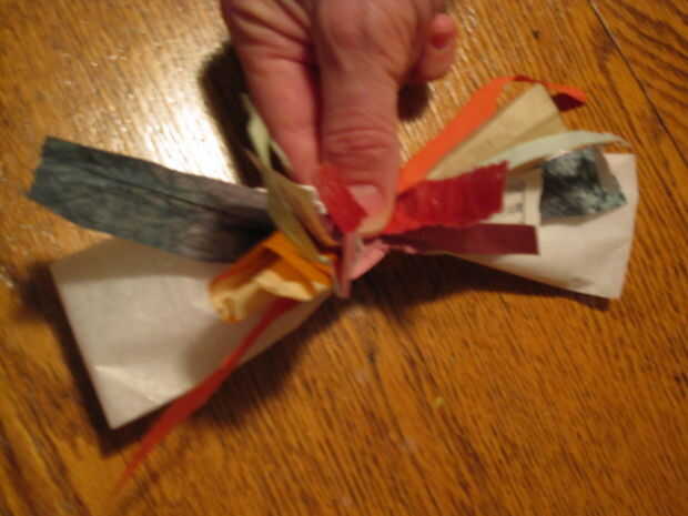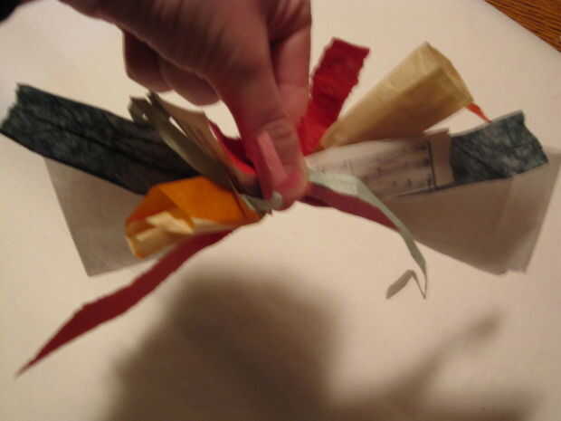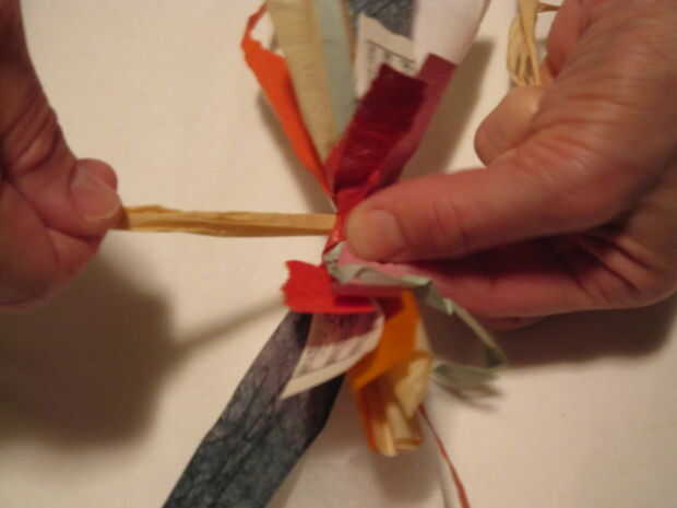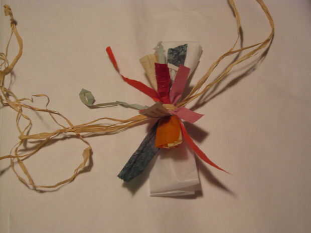 Ahora agregar color a tu arco agregando tus retazos de papel. Uno por uno los pone en su base de arco (papel) y una pizca en el centro con cada papel añadido. Añadir el papel más largo y más grueso primero a pequeño fino (puede hacer que sus documentos estén alrededor del tamaño de su base pero no uniforme). Una vez que usted tenga sus papeles quieres atar el moño con la rafia. Envuelva la rafia de la parte delantera y lazo en la espalda, tienes que envolver si varias veces. MANTENER SU LARGA DE RAFIA! Lo utilizas para atar el arco a su regalo también que asegúrese de que el arco esté en la zona middish.