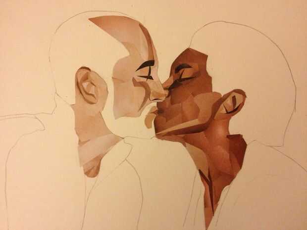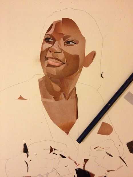 Tríptico de paisaje marino, 2015 (acrílico y lápiz sobre paneles de madera grabado a láser)Se trata de un tríptico hecho de paneles de madera que fueron grabados con un láser de corte y luego fleshed hacia fuera usando técnicas de dibujo y pintura tr