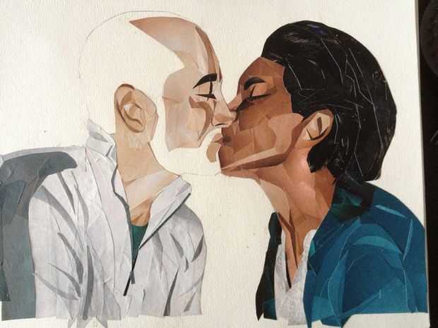 Tríptico de paisaje marino, 2015 (acrílico y lápiz sobre paneles de madera grabado a láser)Se trata de un tríptico hecho de paneles de madera que fueron grabados con un láser de corte y luego fleshed hacia fuera usando técnicas de dibujo y pintura tr