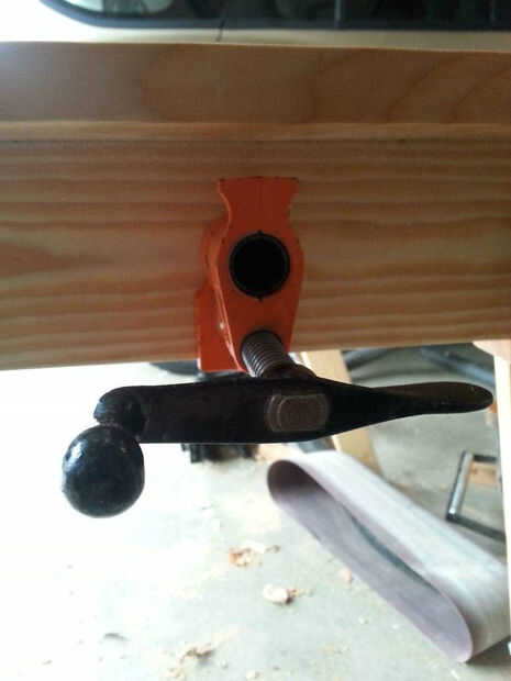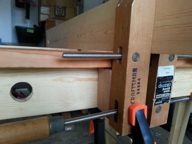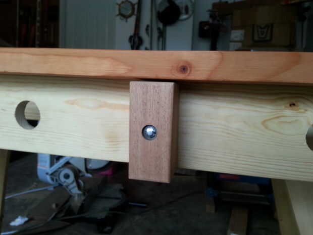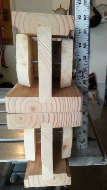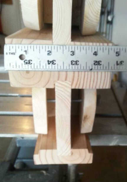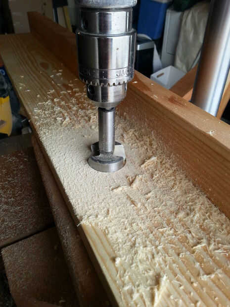 Taladré orificios de 3-1/4" en la viga. 1 en el centro de la viga y 2 exteriores en 9 1/2". Estos agujeros son para apoyar los bloques añadidos construí para sujeción y extraíble - variable aumento, ayudas horizontales.