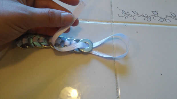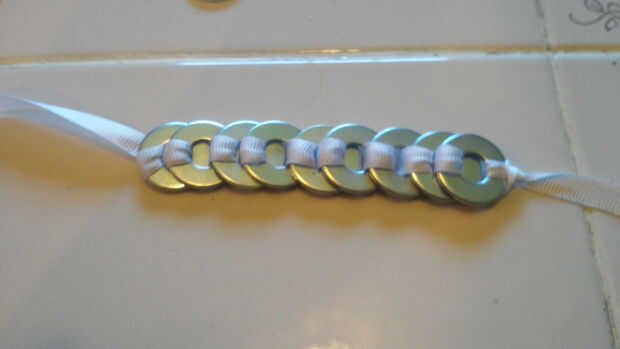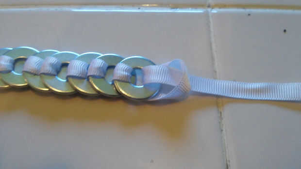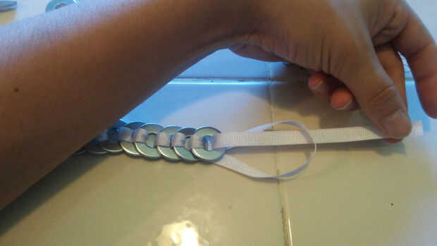 Una vez que el último arranque arandela tirando del extremo de la cinta en la lavadora última, pero en lugar de agregar otra arandela, tire del extremo de la cinta a través del lazo que se hizo en la cinta. Esto será un nudo del collar, mantener todas las arandelas en su lugar.