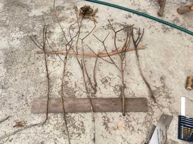 Usted puede averiguar un diseño áspero seleccionando tus ramitas y tendido en el suelo.  Podar las sucursales no deseadas y recortar a la medida.  Usted probablemente va a cambiar este diseño como empezar a armarlo pero ayuda a hacerse una idea de cómo va a ir juntos.