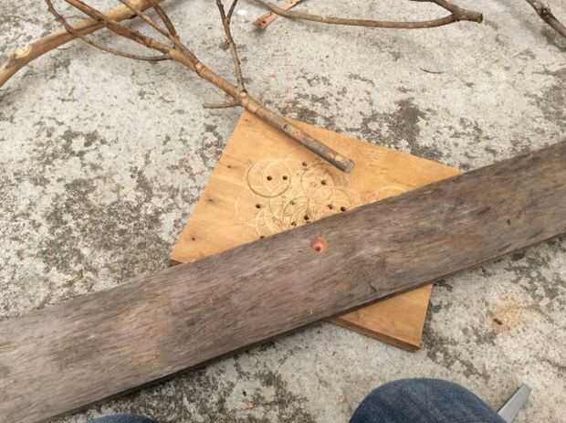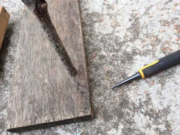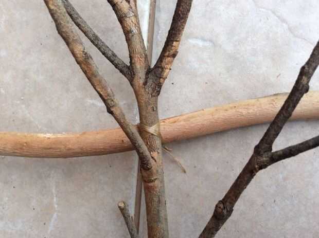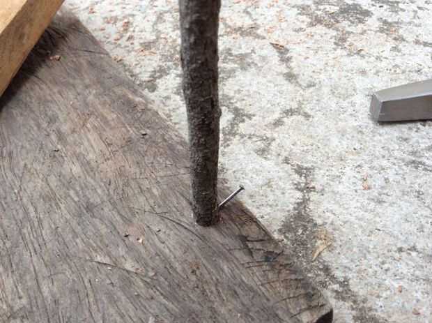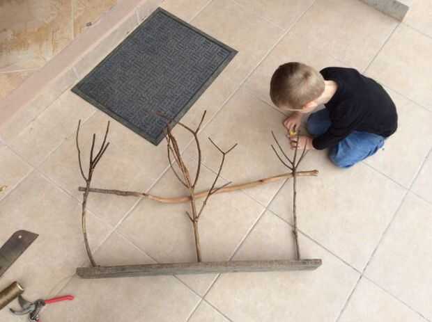 Una vez que usted sabe más o menos donde quieras las ramitas para ir, taladro la tabla con la misma broca de diámetro como base de cada rama.  Pegamento en su lugar.  Poner un clavo de adorno en un ángulo a través de la parte posterior de la rama en la Junta.  Utilizar otro clavo o un juego de clavos para establecer al ras.  Al principio puse sólo en tres de las ramitas por lo pude ver exactamente donde el palo cruzado iría.  Até en su lugar con tendones sintéticos.  Yo usaba ese porque es lo que tenía en mano.  Cordeles de cáñamo o hilo de cobre fino se vería fresco también.  Instalar el resto de los "árboles"