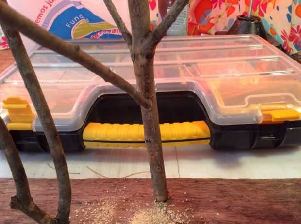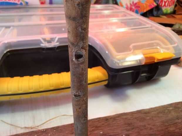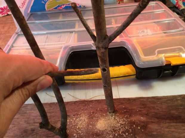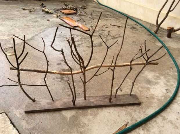 Las ramitas que utilicé no tenían bastante bastante pequeñas ramas para colgar cosas, por lo que acabamos de añadir más.  Sólo recoger ramitas del mismo color y textura y perfore un agujero en un ángulo con el mismo diámetro de la rama.  Encolarla.  Si está demasiado apretado sólo utilice una escofina o papel de lija al final ligeramente cónico.  Ponerlas en largo y cortar a la longitud.