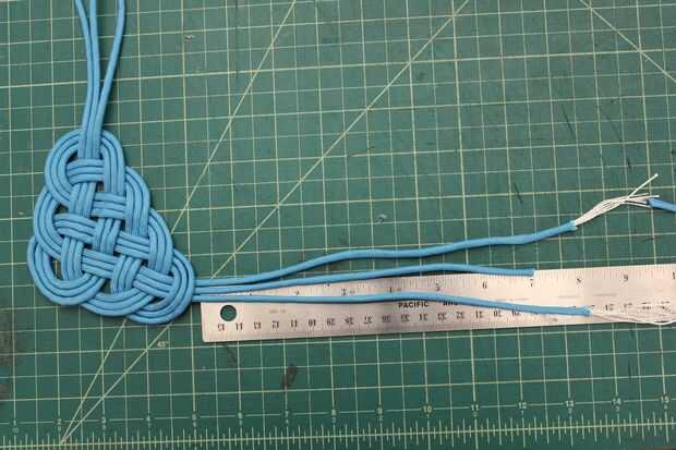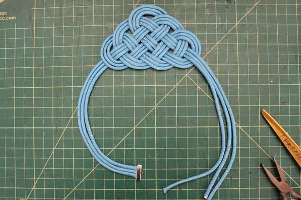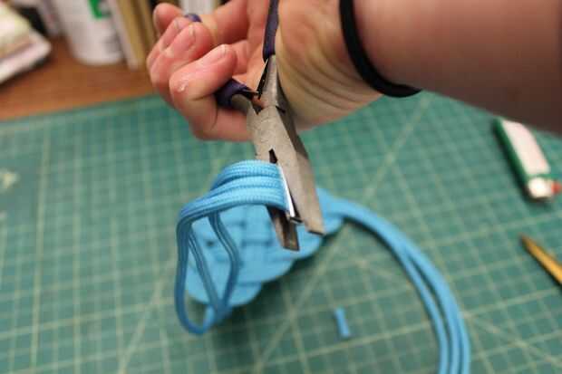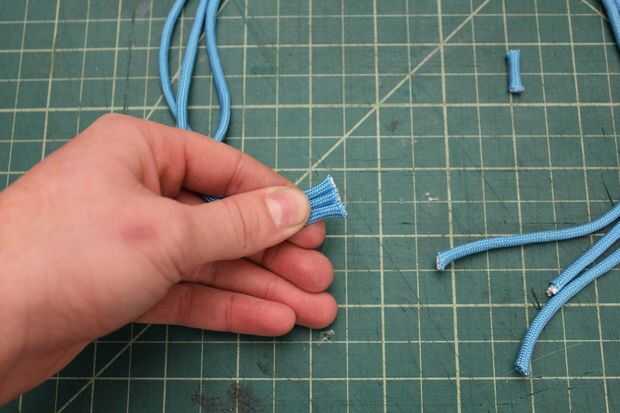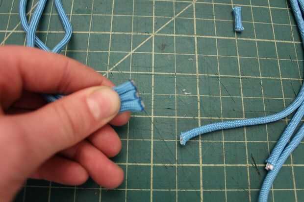 Sin bajar, utilizar un encendedor para derretir suavemente los tres extremos. Luego, usando los alicates planos, apriete las orillas ligeramente derretida paracord para que ellos de la forma cónica.
