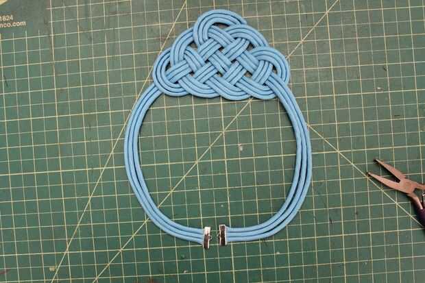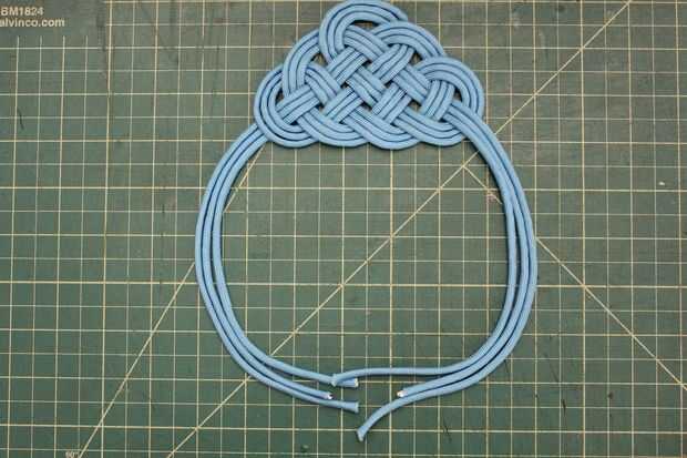 Cuidadosamente, sin alterar la forma, recoger juntos los tres hilos de un lado y cortar las otras dos longitudes para que coincida con la línea media. Esto producirá tres longitudes de tres longitudes diferentes, el interior es la más corta, siendo la exterior la más larga y la media es 7''.