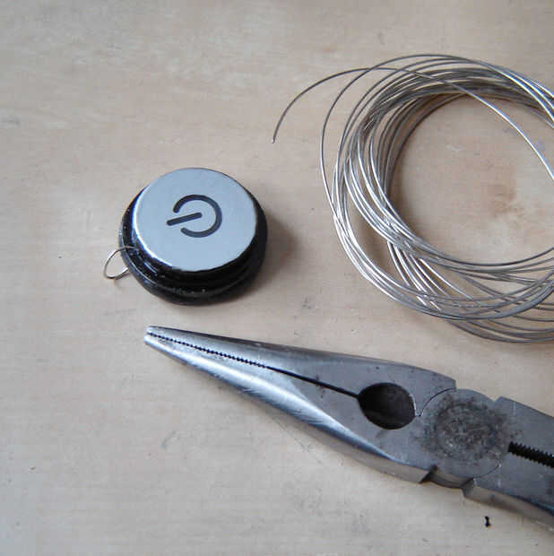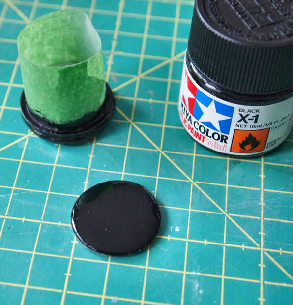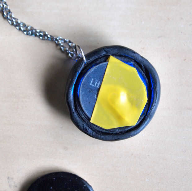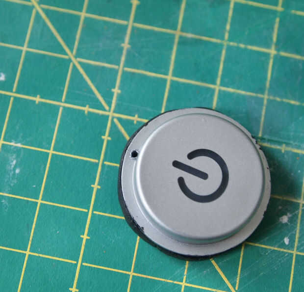Penetra un agujero en la parte superior del botón con un punzón para caber el bucle de la cadena que he formado con joyería alicates de hilo y aguja.  También pinté el borde del botón con pintura negra, porque pensaba que el botón lo contrario podría ser demasiado grande (desde el negro es muy adelgazamiento). También pinté el respaldo para que se vea uniforme.  Una vez que la pintura se había secado apareció en la batería, pero el respaldo en y estaba listo para usar.