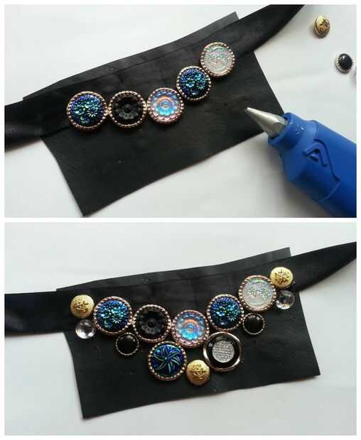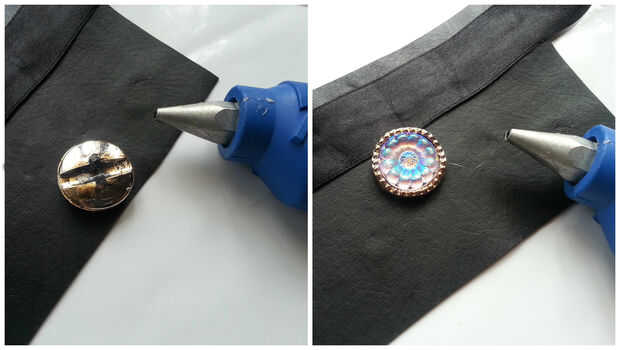 Aplique pegamento caliente en la parte posterior del botón y rápidamente Coloque el botón en su posición (en rexine).