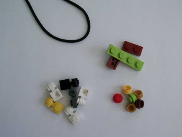Para hacer un collar colgantes de Lego, necesitarás: -1x1s con las cosas tubey en el extremo -cadena o cordón -ladrillos para decorar con como 1 x 2 o 1 x 4 placas o clavos