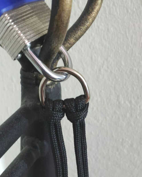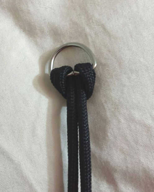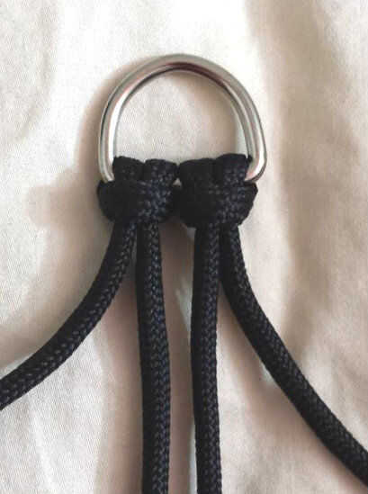Tomé el centro de la longitud de paracord negro y nudo cabeza de alondra alrededor de la parte plana de uno de los anillos en d. Mida la longitud que quiere su collar, luego atar los dos extremos de la paracord negro en dos más de alondra alrededor del lado plano de la argolla. Debe tener dos largos de paracord negro colgando de cada lado de la segunda anilla. Ese será el lado empiezas tu armadura.