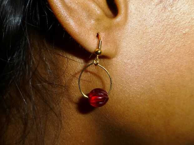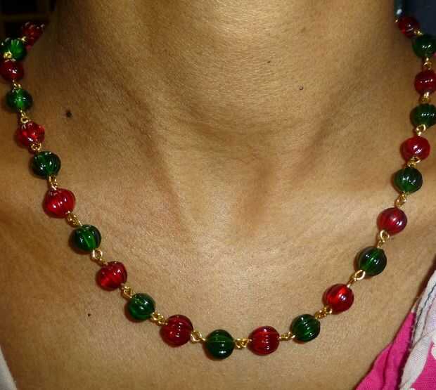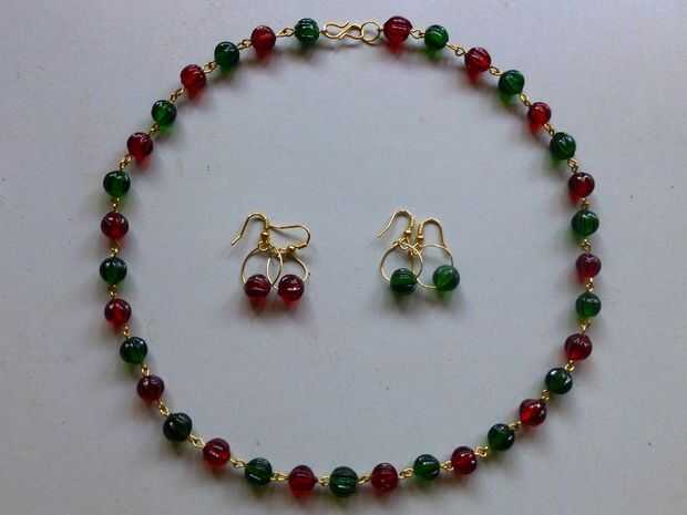 Aquí, yo he combinado abalorios de cristal rojo y verde para este hermoso collar. Dos conjuntos de pendientes se hacen con granos rojos y verdes por separado, por lo que uno puede alternar entre pendientes diferentes colores con el mismo collar.