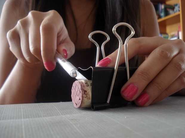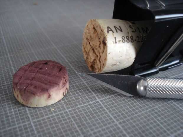 Use un movimiento de balanceo con el cuchillo para cortar cerca de.25 pulgadas del extremo del corcho.