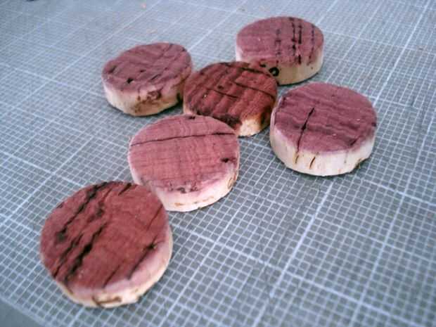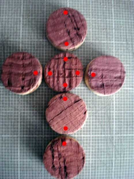 Usar selecciones de diente para perforar agujeros en el corcho, como se muestra en la imagen. Asegúrese de que el agujero no está demasiado cerca el borde y el palillo de dientes va hacia abajo, no inclinada.