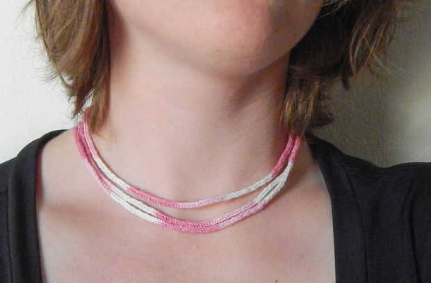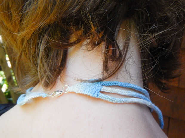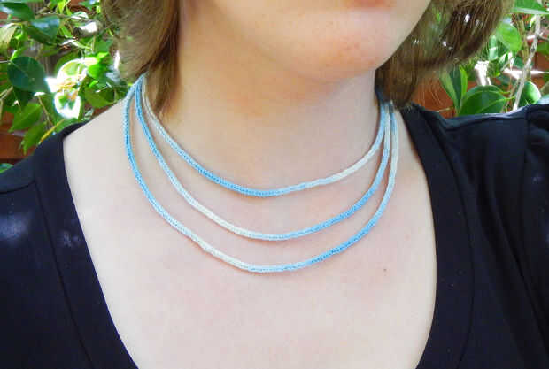 Puede ver la diferencia entre los collares de color rosas y azules. El color de rosa uno tenía sólo 1" diferencia entre cada hebra. Hay una diferencia de 1,75"(casi 2") entre los filamentos de collar azul.