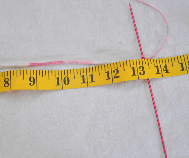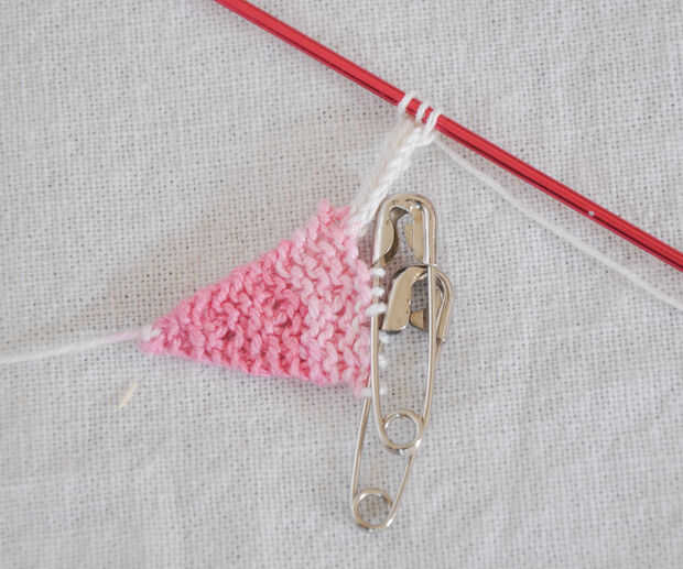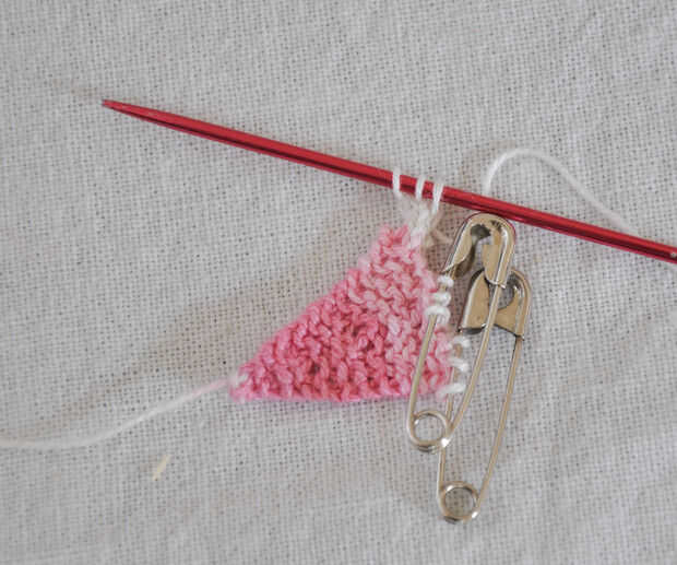 Dejar los 3 puntos de sutura en el extremo (con la cuerda de trabajo) donde están en la aguja, pero toma los otros 2 juegos de 3 puntos y ponerlos sobre pernos de seguridad. Le sugiero cuidadosamente deslizar 3 puntos fuera y ponerlos inmediatamente en un perno de seguridad. Entonces hacer los siguiente 3 puntos. No salga de los 6 a la vez o podría perder una pareja.