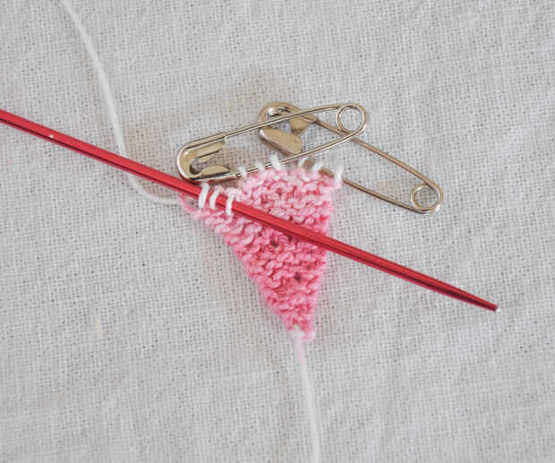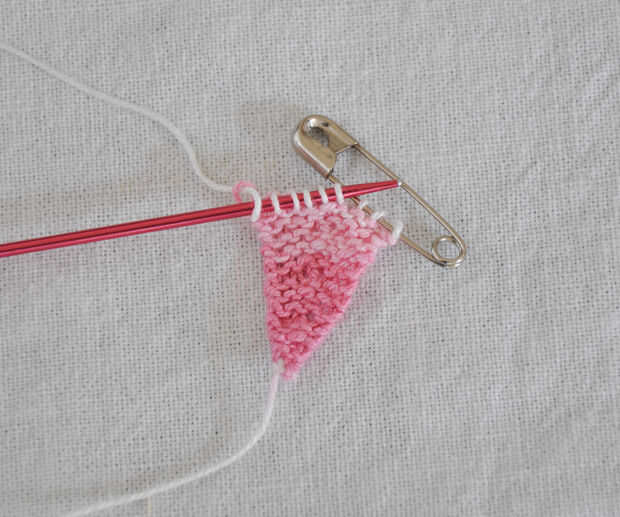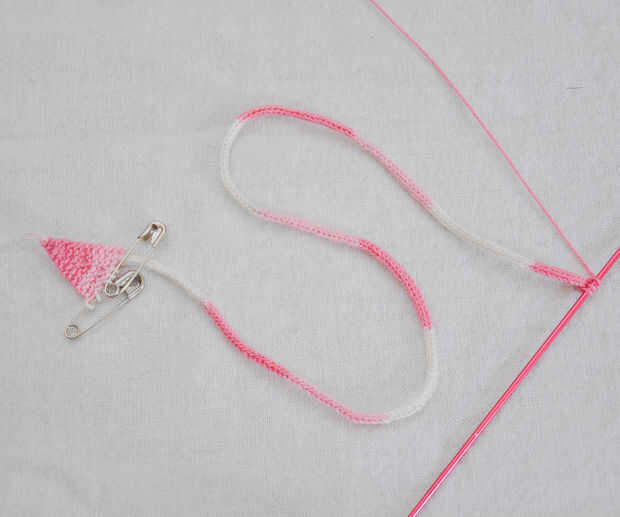 Ahora, vas a trabajar con los 3 puntos que están todavía en su doble aguja puntiaguda. Comenzar cosiendo el cable i.