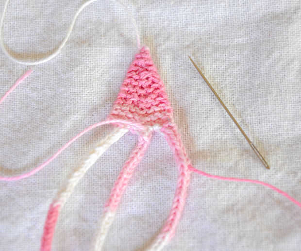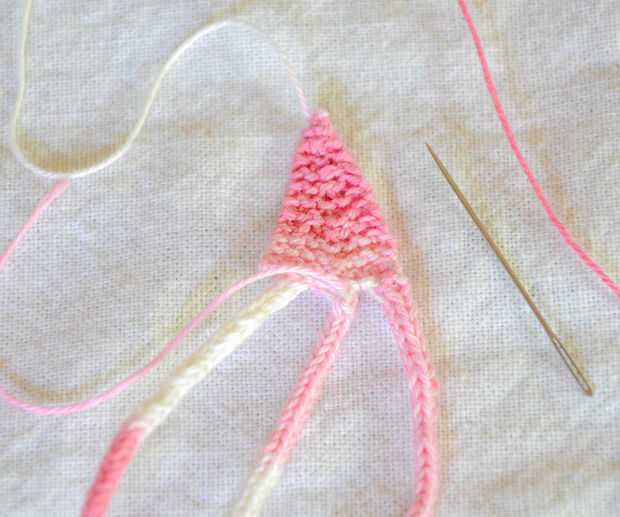 Bueno, dejo el hilo que cuelga del extremo de cada triángulo. Usted va a utilizar en el siguiente paso, pero que desea deshacerse de los que en los extremos de las cuerdas.
