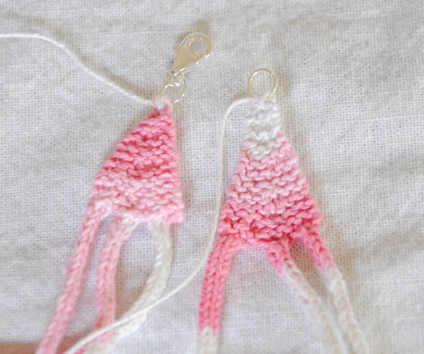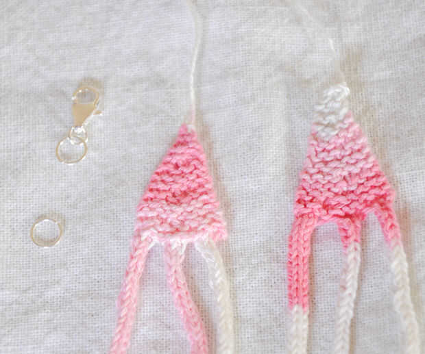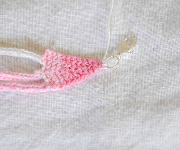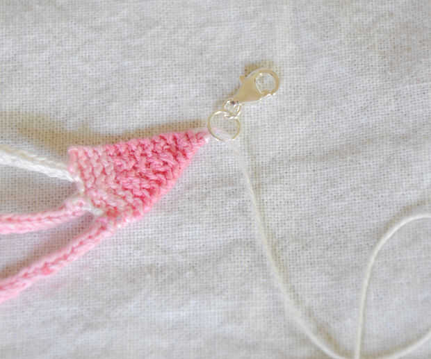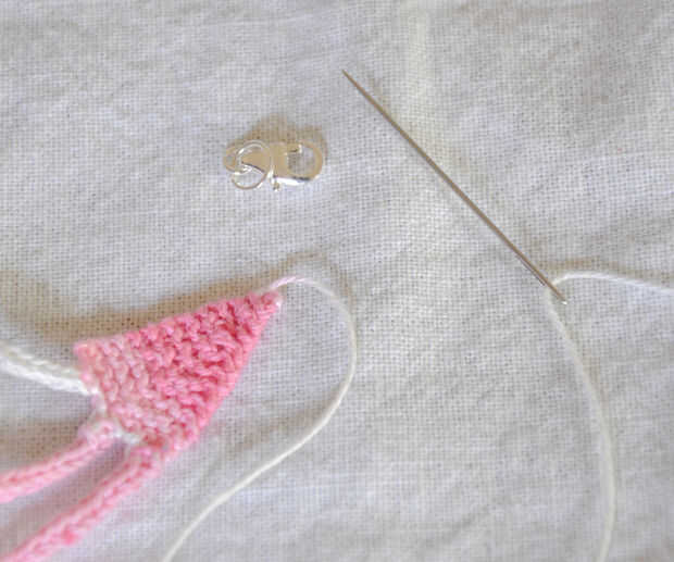 Ahora vamos a utilizar el hilo de la izquierda en las puntas de los triángulos a coser en sus anillas y cierre.