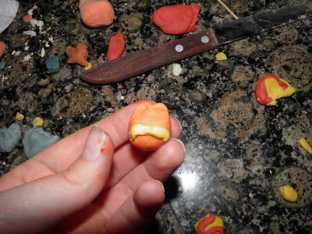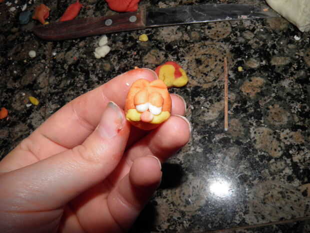 En este paso simplemente agregas los detalles más pequeños. Ojos, pico, narices, bocas, etc, se agregan para hacer el personaje. Recuerde: pensar formas. Nariz ovalada, ojos redondos, etc. Algunas partes necesitan más detalle tales como Garfield ojos y boca. La boca tiene su forma única que usted necesita para mirar la fotografía para obtener. Sus ojos tienen los párpados en la parte superior, para que pueda hacer ojos blancos ovalados y poner una capa fina de naranja sobre ellos para hacer los párpados. Puede que necesite dividir la cabeza en formas más o menos como yo lo hice con la cabeza de Odie en el ultimo paso