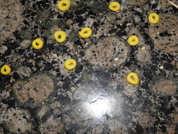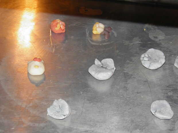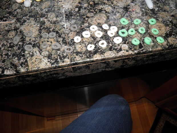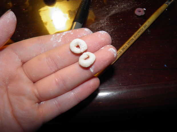 Mientras se hornean las formas, hacer donut pequeño en forma de granos de diferentes colores. Realizar los orificios muy grandes. Usted tendrá un montón de estos, alrededor de 35 más o menos. Usted necesitará estos cueza al horno por unos 15-20 minutos así que agrega a los personajes en el horno después de que han sido allí durante unos 40 minutos.