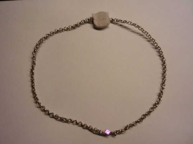 El collar consta de un alambre de latón muy delgado, que puede ser soldado fácilmente con hilo de estaño pequeño. La alimentación de energía es una batería de litio de 3V simple moneda de la célula. Usé una pequeña hoja de papel adhesivo, encontrado en mi farmacia casera, para proteger y aislar la batería.