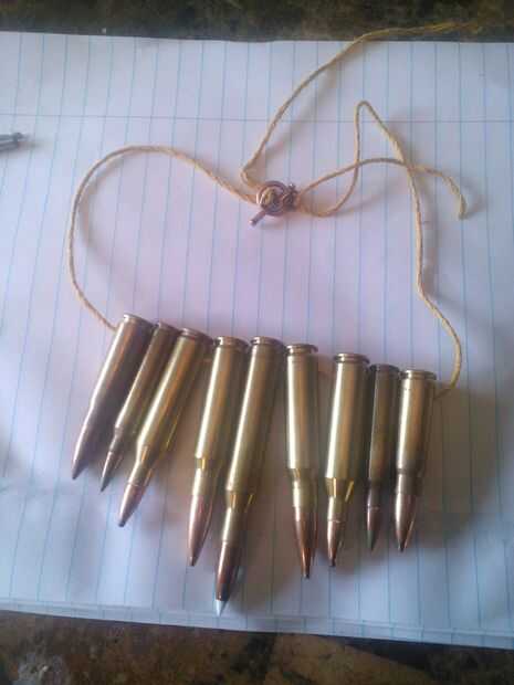 Para empezar, seleccione cómo desea organizar y marcar los puntos donde hay que perforar para que la cadena de pasar las balas. Uno el agujero se perfora, volcar la pólvora con cuidado y apartar. Utilicé un poco más grande y chaflanado de los bordes de los orificios que estén libres de rebabas. La cadena a través del hilo de rosca y añadir los corchetes.