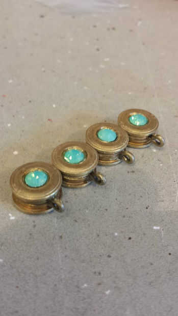 Quería un color añadido a este mar de bronce. He encontrado algunas joyas de una pulsera que compré en mi tienda de artesanías de vidrio. Eran apenas el tamaño correcto caer en el agujero perforado en la cartilla. Utilice el mismo epoxi para este paso. Van en la viñeta principal, gemelos, extremos pegados y pendientes.