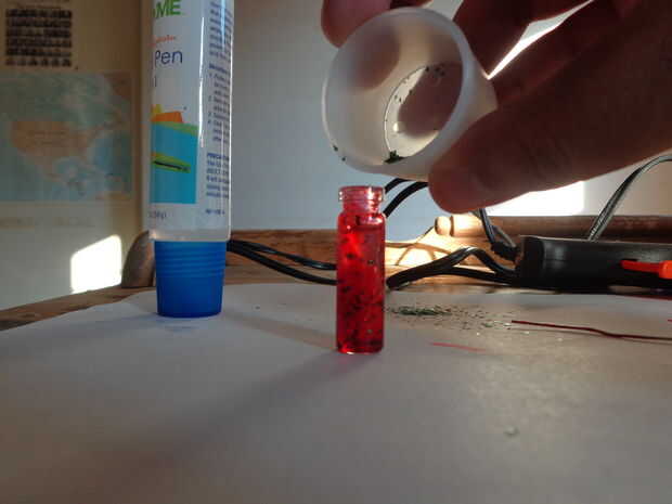 Añadir el resto del algodón, luego agregar poco más de pegamento. Mezclarlo todo. Ahora usted debe tener la botella sobre todo completa. Si no añade suficiente pegamento para llenar casi, puede que también necesite agregar algodón más si haces esto. Una vez que la botella está casi llena añadir un poco más de brillo y luego poner el corcho en y sacúdalo.