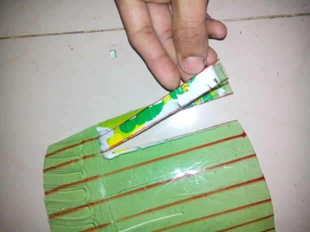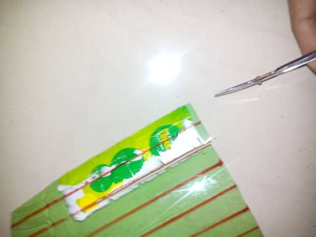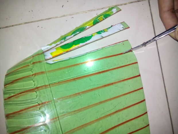 DESPUÉS DE DIBUJAR LÍNEAS RECTAS EN LA PARTE MEDIA DE LA BOTELLA DE PLÁSTICO, CORTE OTRA VEZ A TRAVÉS DE LAS LÍNEAS PERO NO HASTA EL FINAL.