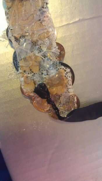 esta pulsera coqueta tiene mica en la pelusa de la cinta. Sólo parece peligroso; los bordes de la mica son bastante flexibles y no cortan pero brillan un poco. Los botones vintage son un contrapeso a la cinta y la mica.Ingredientes- 5 etiquetas de mi