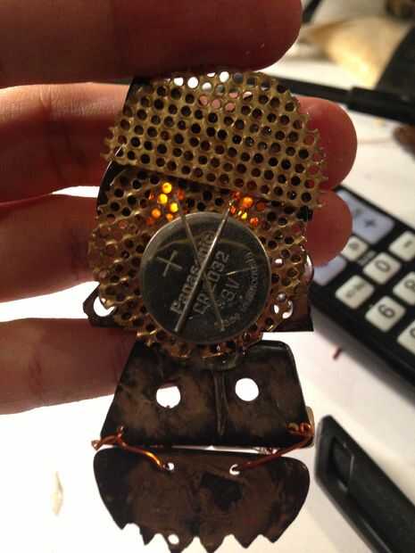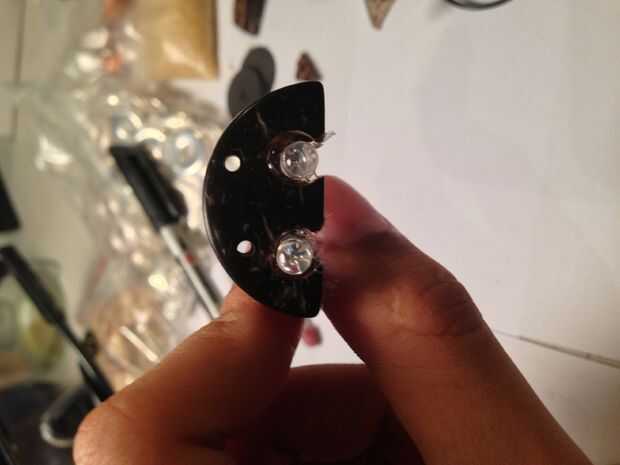 Doblar primero las patas más cortas de los leds, luego colocar el polo negativo de la batería en la parte superior, luego doblar las otras patas led para que la batería esté asegurada.