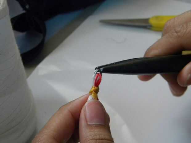 Conecte la borla en la parte inferior de la linterna. Conectar en la linterna colocándola entre (donde se cruzan los cables) para llevar a cabo la borla y no se deslizará.