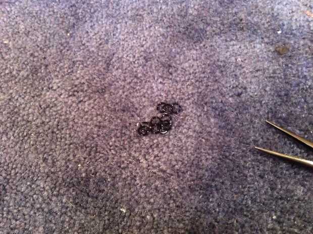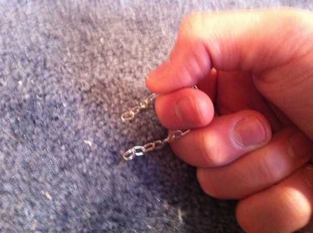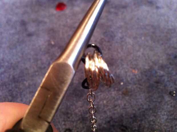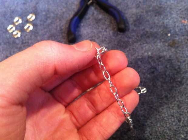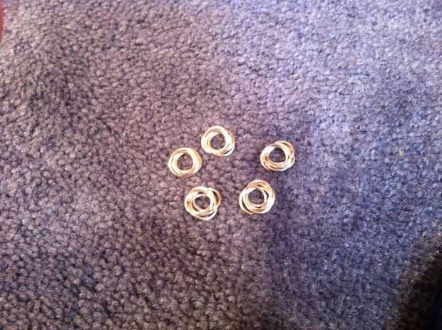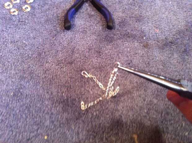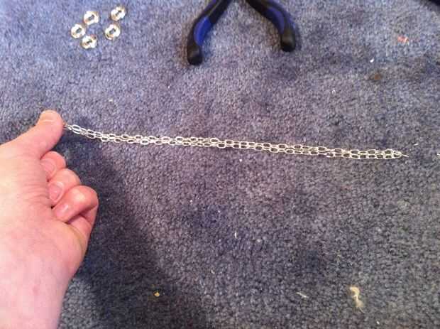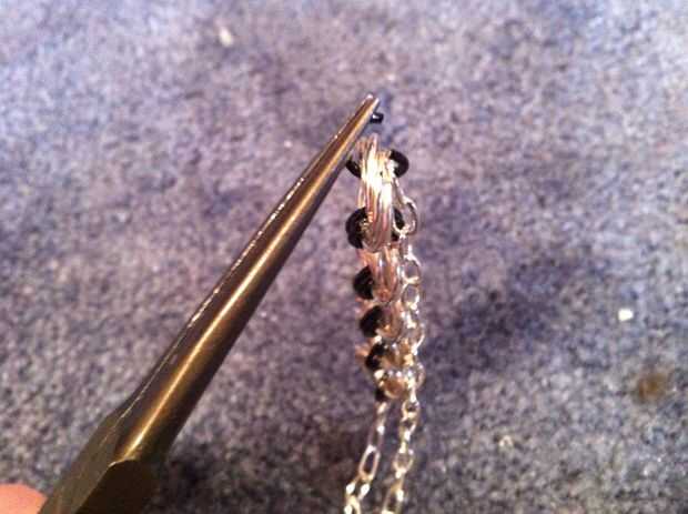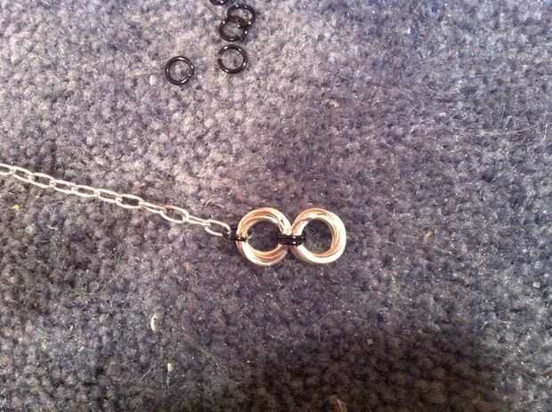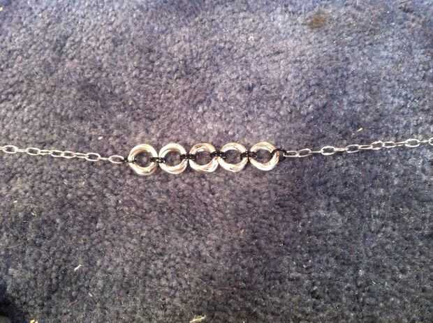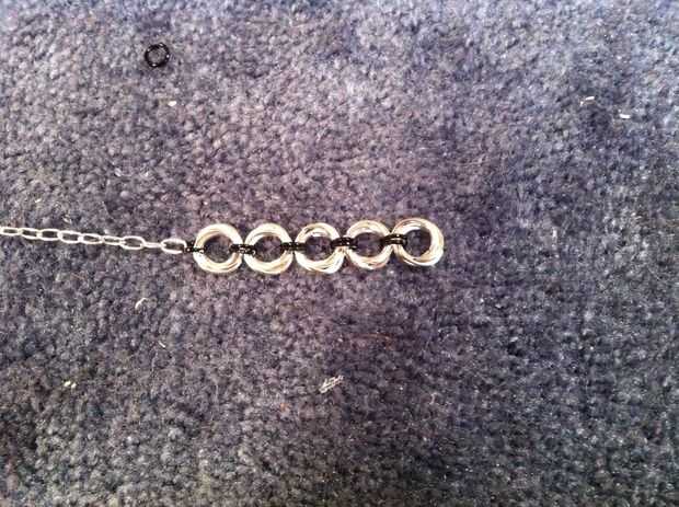 Ahora usted debe tener 5 mobiuses(?) si no, repita el paso 2. Ahora necesitas encontrar el centro de su cadena del collar. Una vez que ha hecho ahora deberá comenzar a montar el collar. En primer lugar tomar uno de sus más pequeñas anillas y colócala en tu todo mobius y el final de la cadena del collar. Tomar dos anillas y enrósquelos por mobius otra y luego por la primera de ellas y cerrar. Repetir hasta llegar al final y el último mobius solamente poner un anillo a través de y conecte el otro extremo de su collar, y... HUZZA! en el siguiente paso!