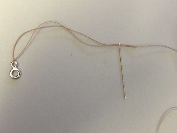 Enhebre la aguja y correr hasta el final de cierre, enhebrar la cola a través del ojo de la aguja, también. El primer diente se encadenan en ambos hilos para asegurar el nudo y esconde la cola. Se recorta la cola al ras después de su primer diente.