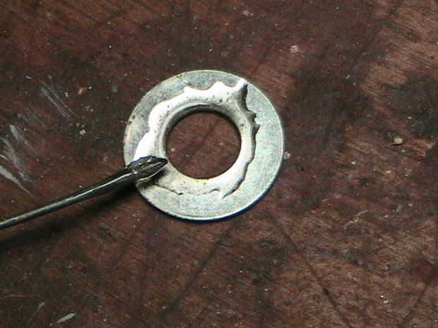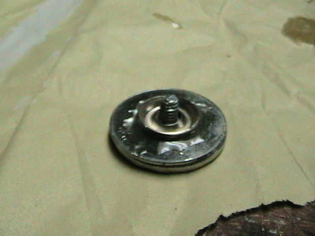 Una vez que ha secado su perno de la leña, mezclar un poco más de epoxy y manchar alrededor del orificio de la arandela grande. Coloque su boca abajo del perno de la leña en el agujero, construyendo alrededor del borde con epoxy para la fuerza.