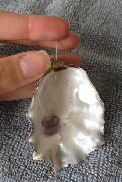 4) elegir una tira del centro (mina es una verdadera perla de ostra, pero sienta libre de conseguir perlas falsas si quieres puesto que van a ser redondos) utilizar pegamento para pegamento del gorila para shell.