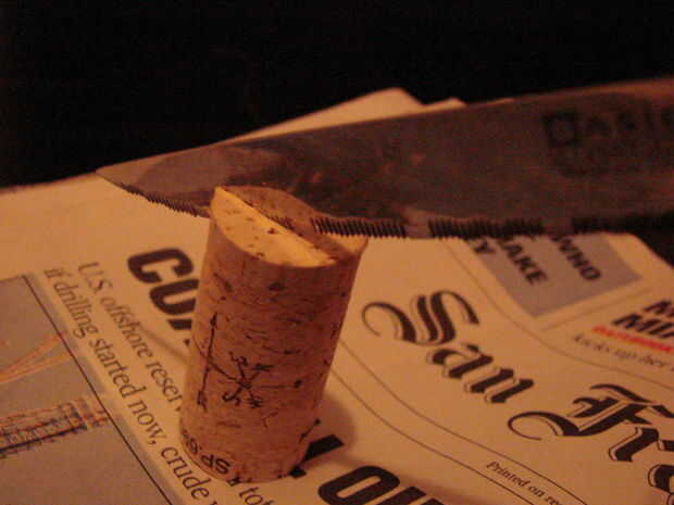 Corta el corcho a la mitad con un movimiento de sierra. Proteger la superficie de trabajo y mantenga los dedos lejos de la lámina.