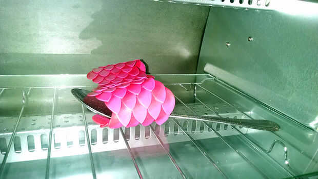 Ahora aquí está la parte difícil, que los extremos a unirse y permanecer el tiempo suficiente para hornear una última vez. Poner en su pegamento y unir los extremos, que empareja a la escalonada que una ronda perfecta. Entonces usted quiere conseguir una herramienta muy avanzada de la especialidad que no derrita en el horno. Me gusta llamar mío una "cuchara". Con la servidumbre hacia abajo tomar la "cuchara" y manténgalo durante la costura. Si usas un horno artesanal como la mía, entonces hay un problema leve de la quema de la parte superior. Así que Hornee durante menos de 10 minutos para comenzar con y ver de cerca. Puede ser blando y parece que va a aplanar. Esto es aceptable.