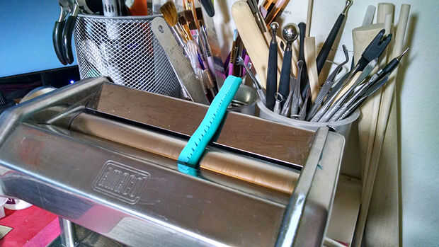 Sé que hay todo tipo de formas diferentes de hacer esto. Pero yo quería controlar el ancho con el fin de no perder la arcilla, sino también para el control de la zona con el gradiente. Todavía quería que lo contrario termina para conservar el color original. ¿Por qué? Porque estoy usando un cortador pequeño y en una mezcla de skinner regular, la zona de gradiente (donde se mezclan los colores) puede fácilmente convertirse en demasiado grande.