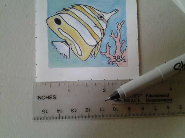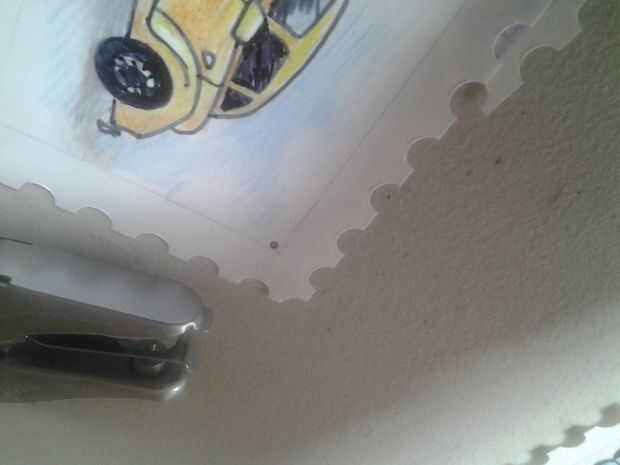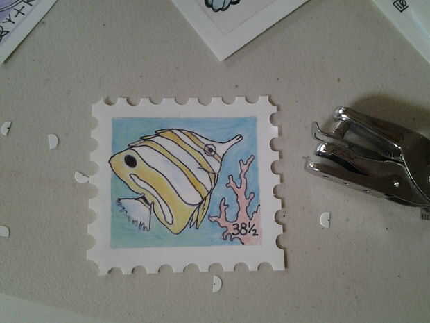 En primer lugar, utilice una regla y un marcador para marcar a intervalos regulares donde deben ir los agujeros. Para un sacador de agujero de tamaño estándar, cada 3/8" deberían crear un bonito patrón. Cuando se hace, necesita alinear el sacador de agujero para que el punto marcado aparece en el centro de donde va a ser el agujero (de modo que se corta medio círculo). Para ello en todos los bordes de los sellos.