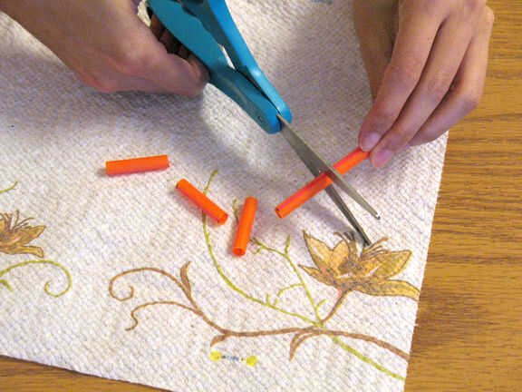 Hasta que el pegamento se seque, pegue una paja dentro del frasco y marque donde su altura va a ser con el marcador permanente. Cortar la paja según altura y repita para el resto de la paja.