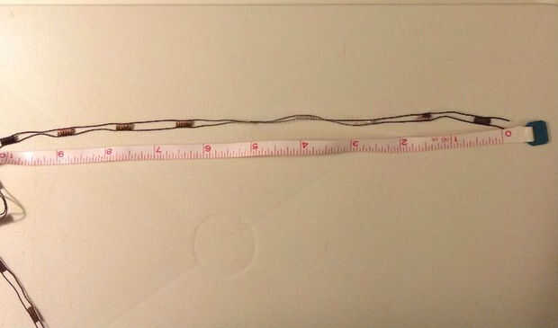 Usted necesitará por lo menos 60 pies de cinta escalera y una pequeña cantidad. El collar que hice es seis hilos y cada hilo tomó 10 pies de cinta. Puede agregar más o menos hilos basados en cuán grande quieres el collar. Usted necesita medir nine(9) pulgadas desde el extremo de la cinta para empezar a tejer.