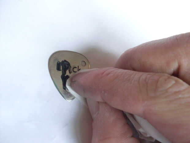¿cansado de perder tus selecciones de la guitarra? Heres bien una manera de no perderlos... Uhhh algo como eso...Paso 1: Elementos que se necesita Necesita1. un marcador Sharpie2. un clavo Filer3. una guitarra Pick4. tarjeta de crédito5. tijeras (no
