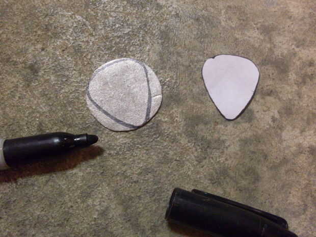 hacer una simple guitarra recoger de muestras de vinilo sinPaso 1: Trazar la selección Después de elegir escoge el color que desee para su cinta de recoger su propio o guitarra elegir forma de Internet y rastrear en la parte posterior con un lápiz.Yo
