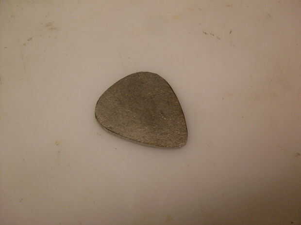 En primer lugar, conseguir la forma de una púa de guitarra, puede imprimirlo de internet o bien trazar una selección que ya tienes. Entonces negociar el níquel hasta que la hoja quede en él. Una vez que cabe, traza la forma sobre la hoja y recórtalo. Utilizar una esmeriladora de banco para cortar hacia fuera pero una sierra funciona igual de bien.