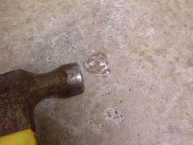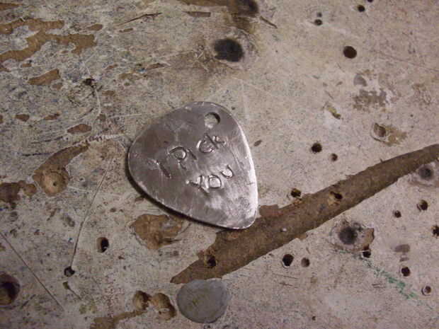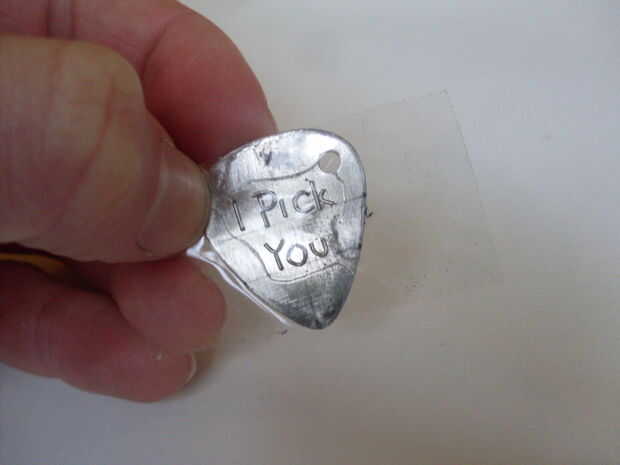 Ahora uso un martillo y martillo sobre las letras grabadas, esto estampe en la selección. Cuando termines el martilleo de la cáscara se debe dejar la cinta fuera y con el texto que elegiste.
