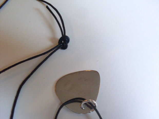 lo que necesitaPick de guitarraHilo o una cuerda fina (sobre un pie)Paracord o cuerda para pulseraAlgún elemento para poner un agujero en el pico (yo usé un tornillo y un bloque de madera un martillo y clavo funciona demasiado, siempre y cuando el ag