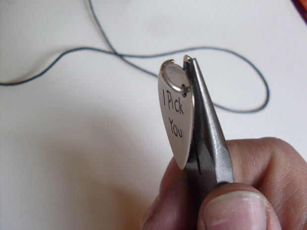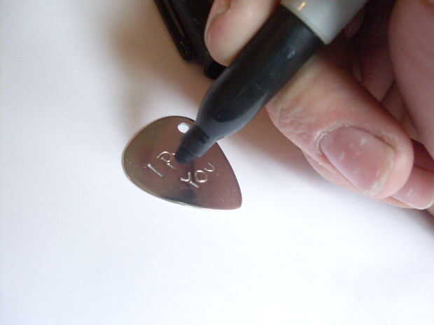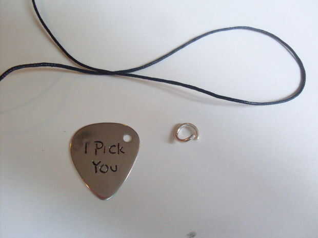 Para obtener las letras que realmente se destacan dibujar sobre ellos con una pluma sharpie o pintura, y luego limpie el exceso con una toalla de papel. Ahora todo lo que necesita hacer es colocar un anillo del salto y la médula a la selección, usted tendrá que experimentar lo que funciona mejor, pero 18 pulg es sobre la longitud media para collares.